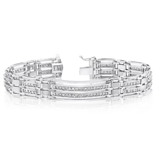 Stylish and striking mens bracelet set with 116 round diamonds channel set from end to end secured with a strong and heavy locking in 14KT white gold.